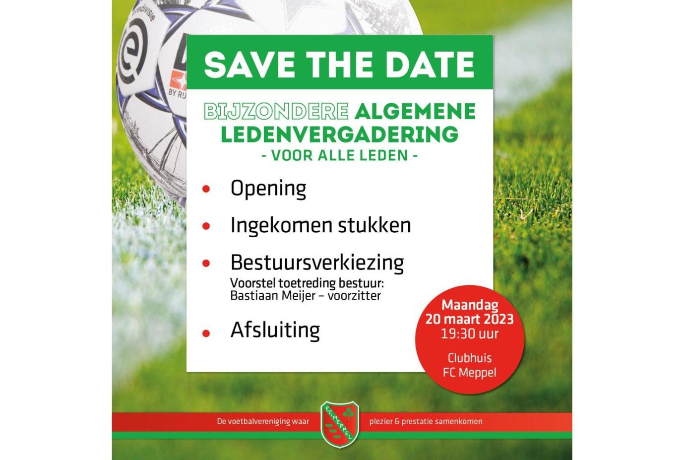 Het bestuur van FC Meppel nodigt u uit tot het bijwonen van een Bijzonder Algemene Ledenvergadering die wordt gehouden op maandag 20 maart 2023, aanvang 19.30 uur in het clubhuis.