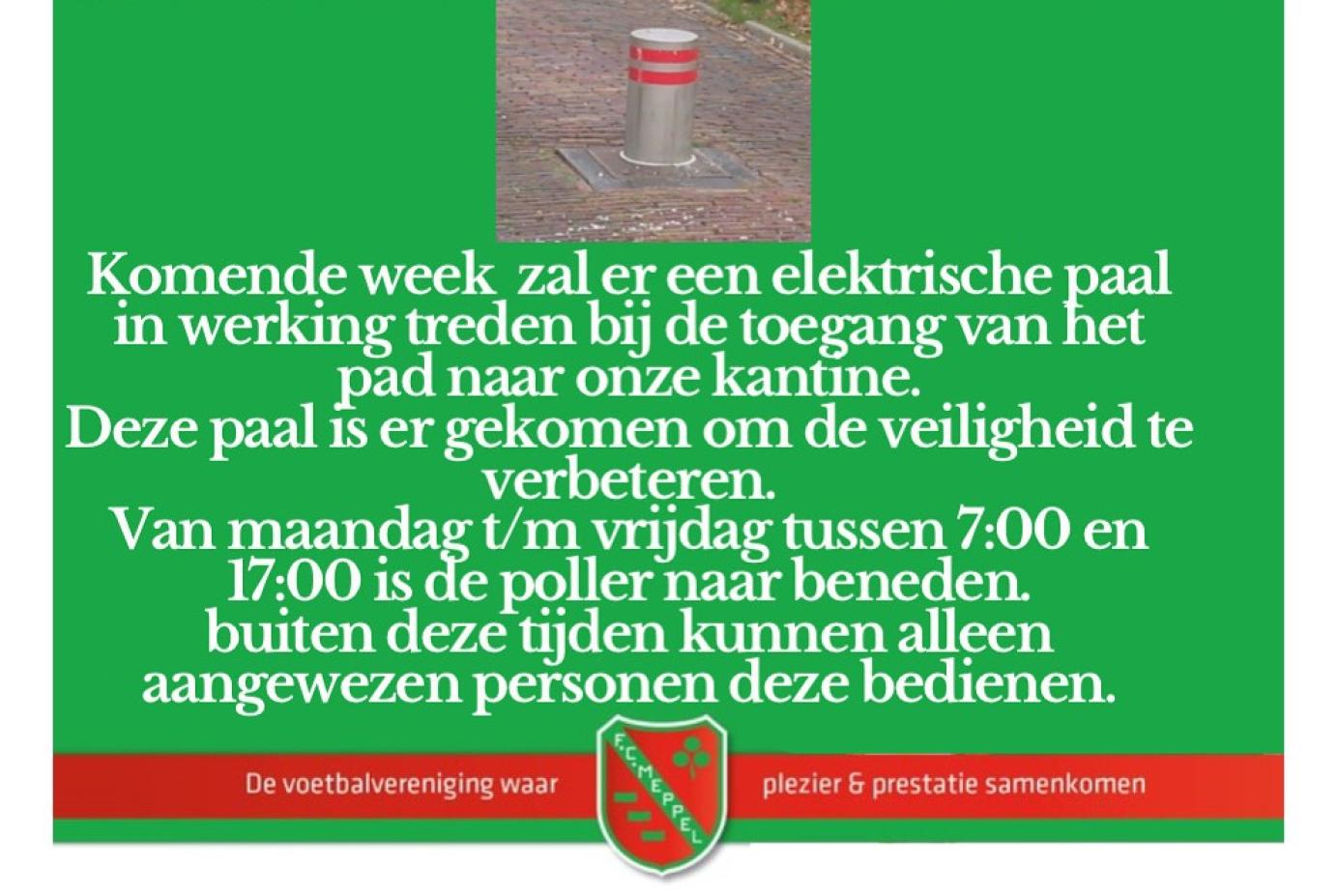 Komende week zal er een elektrische paal in werking treden bij de toegang van het pad naar onze kantine. Deze paal is er gekomen om de veiligheid te verbeteren. Van maandag t/m vrijdag tussen 7:00 en 17:00 is de poller naar beneden. buiten deze tijden kunnen alleen aangewezen personen deze bedienen.