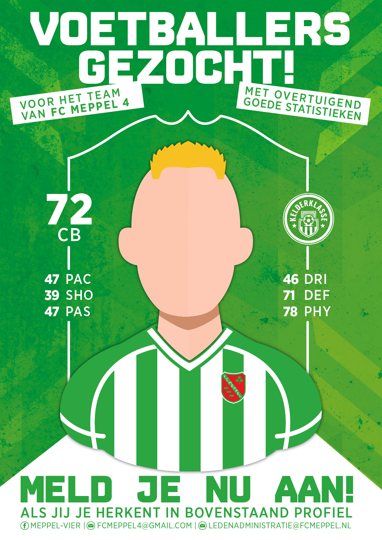 FC Meppel 4 is voor komend seizoen op zoek naar nieuwe spelers. Wegens allerlei redenen ontstaat er voor komend seizoen een klein tekort. Herken jij je in één van onderstaande profielen? Dan zoeken we jou! Herken je jezelf niet, maar wil je wel komen voetballen? Dan zoeken we jou ook! Neem contact op met fcmeppel4@gmail.com of spreek één van ons aan!