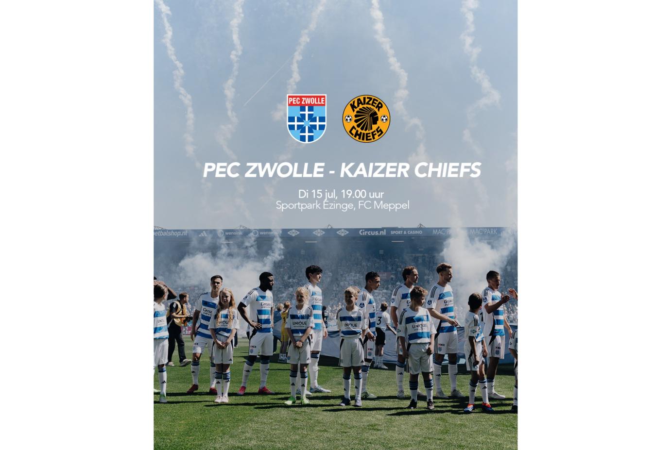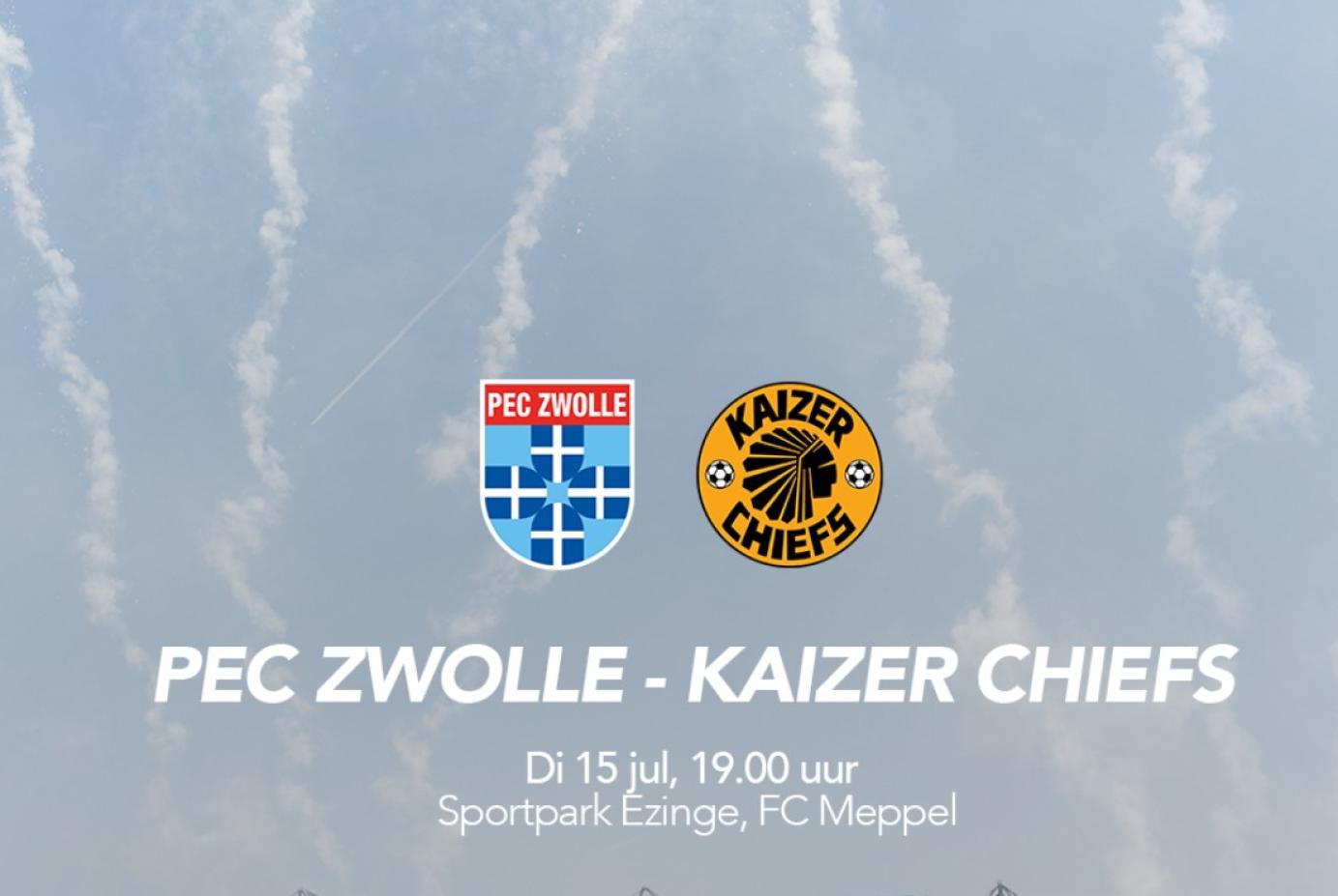 Een prachtige voetbalavond staat ons te wachten in Meppel! Op dinsdag 15 juli om 19:00 uur ontvangen wij op Sportpark Ezinge niemand minder dan PEC Zwolle en de Zuid-Afrikaanse club Kaizer Chiefs voor een bijzondere oefenwedstrijd.
