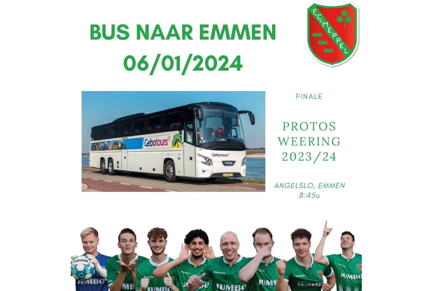 Omdat FC Meppel zich knap heeft weten te plaatsen voor de finale van het Protos Weering zaaltoernooi zullen er bussen naar Emmen rijden. Je busticket geldt als entree ticket! Zonder busticket is de kans erg klein dat je de sporthal binnen komt, vanwege de vele animo vanuit alle geplaatste finale teams en hun supporters.