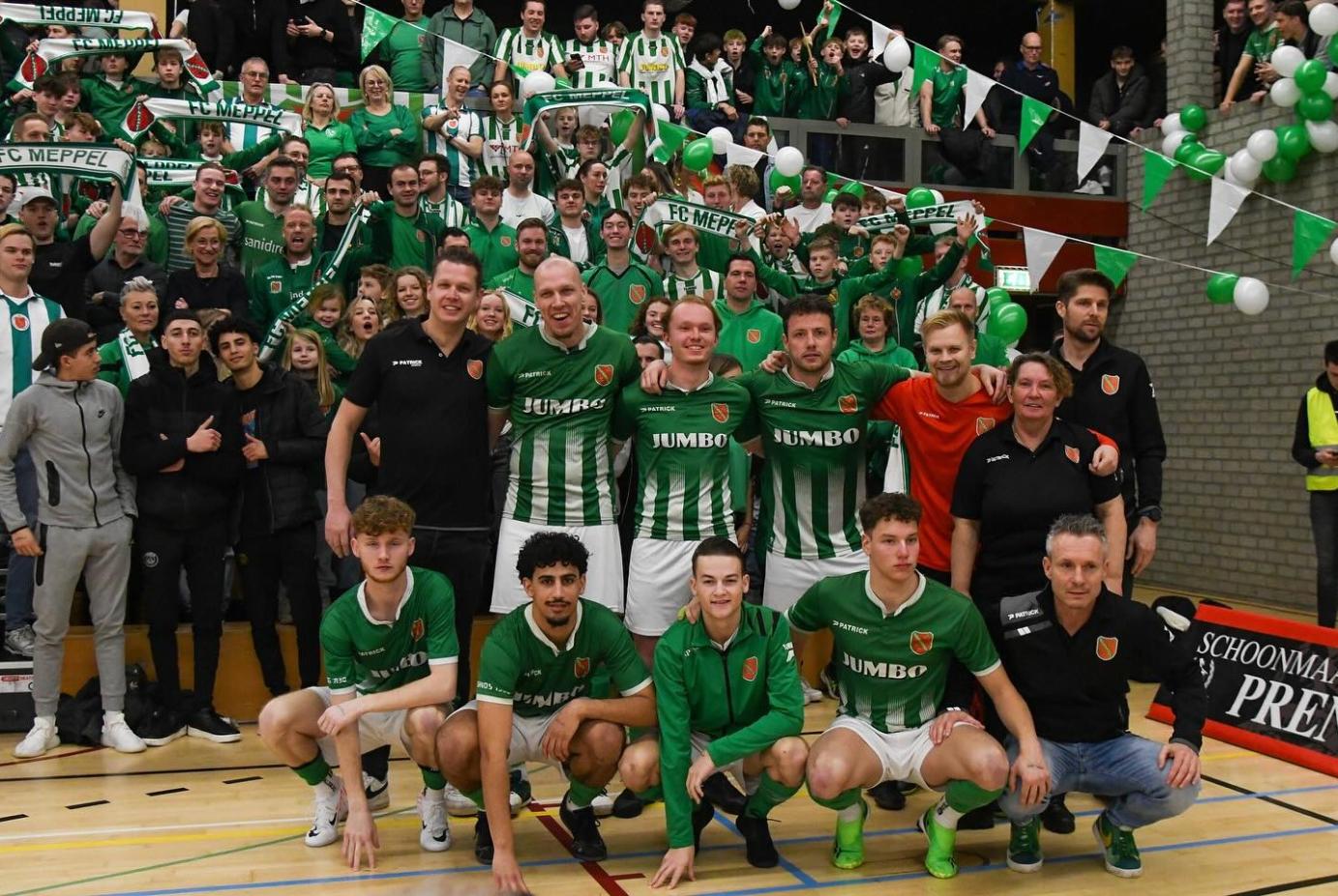 Met een leuke, fanatieke groep supporters gingen we in bussen richting de sporthal Anegelslo. Eenmaal aangekomen voelde en zag je letterlijk de sfeer al hangen. Een zaal vol versieringen, het hoekje van Meppel zag er natuurlijk het mooiste uit