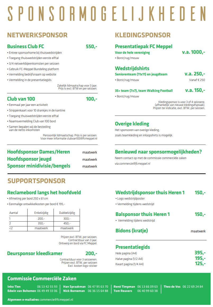FC Meppel is trots op het vertrouwen dat ouders, kinderen en andere leden stellen in FC Meppel. Onze vereniging - met meer dan 100.000 vrijwilligersuren per jaar - vormt daarmee een maatschappelijke spil in Meppel en omgeving. Maar onze vrijwilligers kunnen het niet alleen. Daarom zijn wij verheugd in uw interesse in het sponsorschap bij onze mooie vereniging.