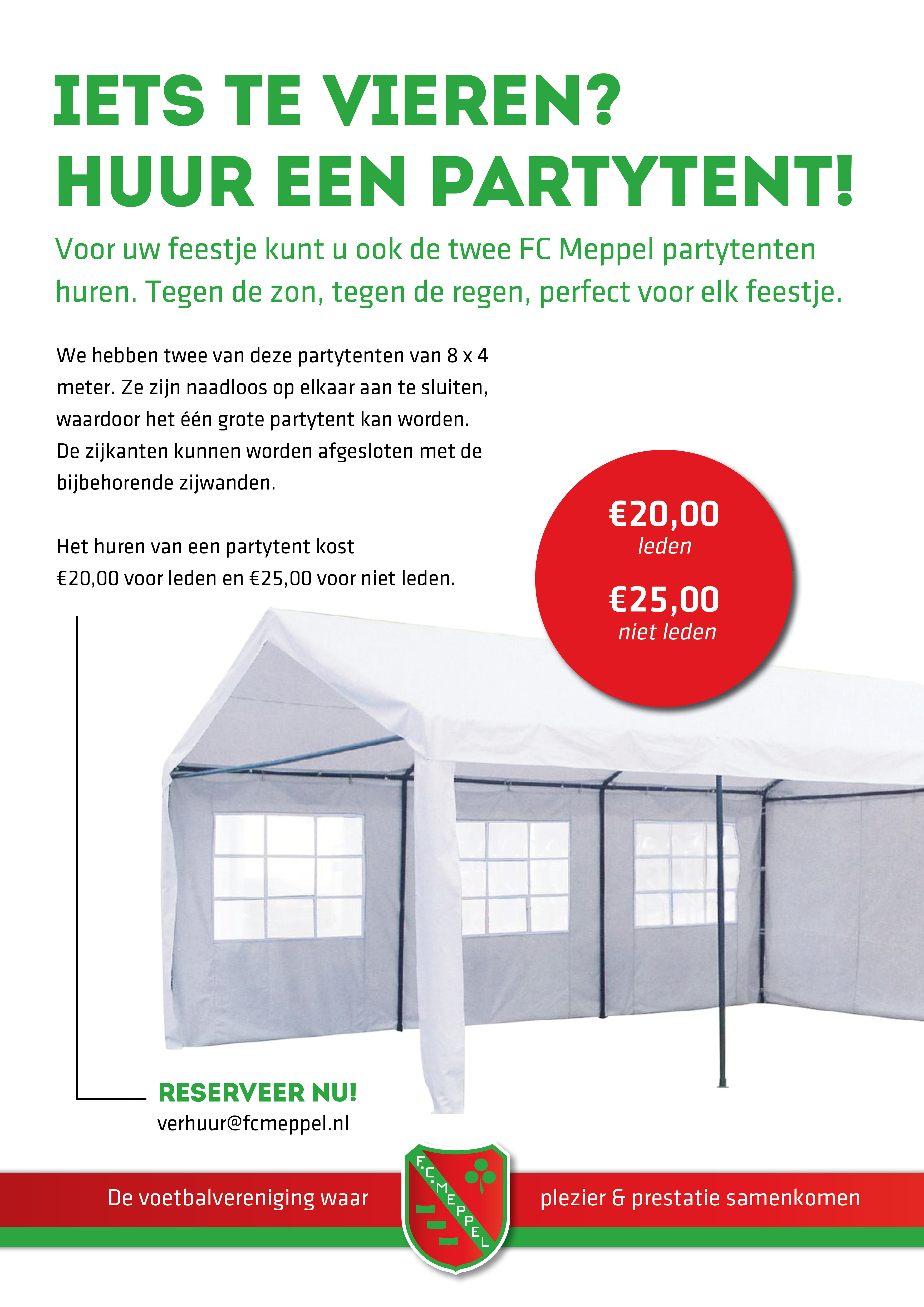 Het huren van een partytent kost € 20,- voor leden en € 25,- voor niet leden. U kunt contact opnemen met verhuur@fcmeppel.nl.