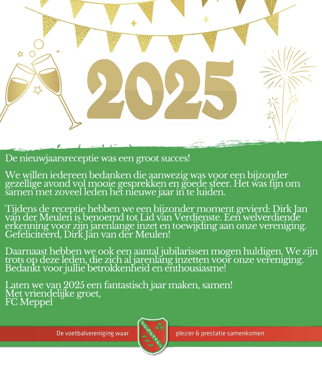 Zaterdag 4 januari 2025 is het nieuwe jaar ingeluid bij FC Meppel met de nieuwjaarsreceptie. Een volle en feestelijke avond.