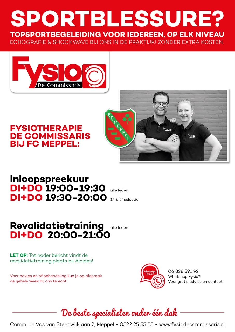 Voor alle leden is het mogelijk om gebruik te maken van de sportmasseur van FC Meppel en de fysiotherapeuten van Fysiotherapie De Commissaris. In onderstaand schema staan de tijden/dagen vermeld wie wanneer aanwezig is.