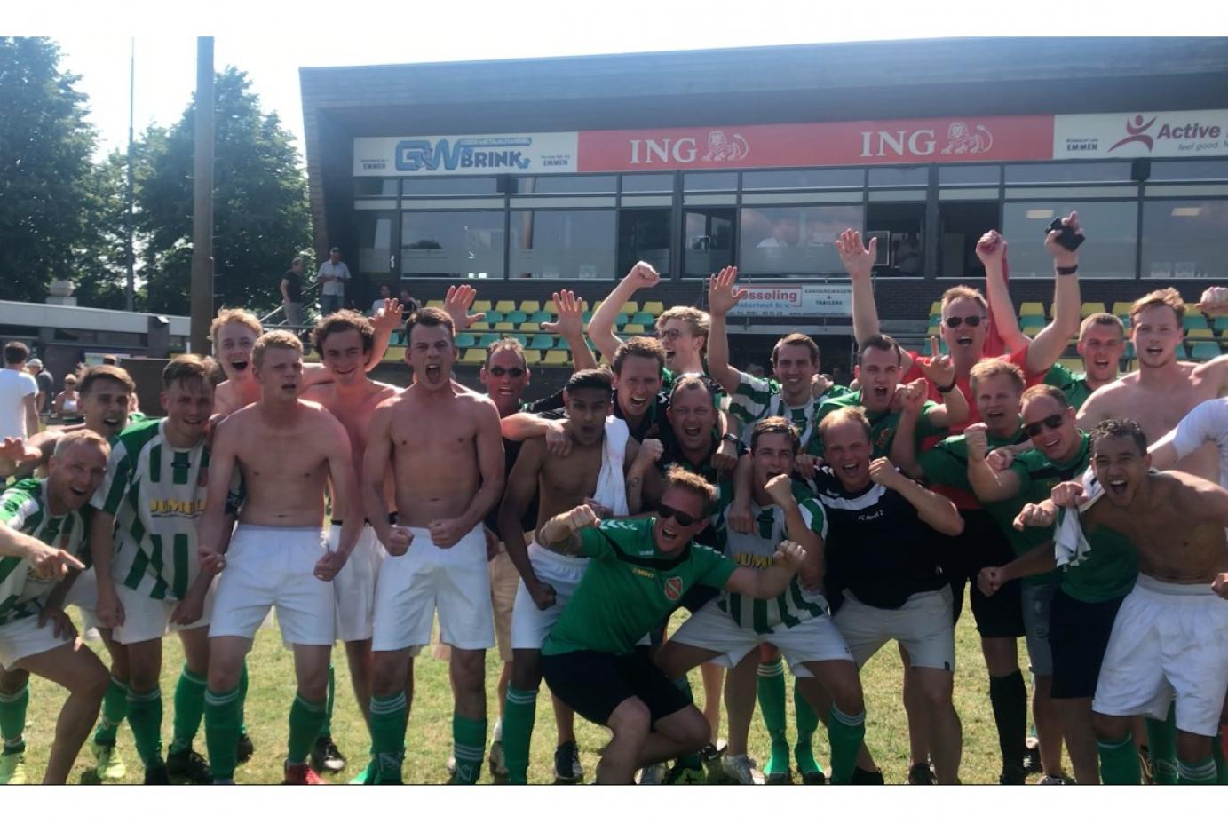 Dat bleek ook wel, want alle goede intenties ten spijt, de ploeg uit Emmen startte feller en Meppel leek stijf van de zenuwen te staan. Na ongeveer 15 minuten kwam de thuisploeg op 1-0 via Bastin Boer. Er volgden daarna nog enkele kansen en in de 25e minuut stond er 2-0 op het scorebord. Door de stand van 2-0 bij Groen Geel stonden de groen-witten op nacompetitie. Kort daarna werd Meppel weer in de wedstrijd geholpen door een domme rode kaart van een speler van DZOH. Daarnaast greep het trainersduo in en bracht Wiebe de Jong in het veld voor Maarten van Olphen. Dit bleek een gouden wissel, want op slag van rust scoorde De Jong fraai uit een corner van Hans Mansveld. Met 2-1 gingen beide ploegen ook de rust in. Net als vorige week kwam Meppel goed uit de kleedkamer en gooide alle schroom en spanning van zich af. Er kwam weer power in de wedstrijd. Dit resulteerde in de 54e minuut in de gelijkmaker van Emiel Kwant, uit weer een corner van Mansveld. Bij deze stand en de voorsprong van Groen Geel zou Meppel veilig zijn. De wedstrijd op slot gooien en uitspelen was het devies van de trainers. Helaas bleek dat de jonge ploeg hiervoor de ervaring nog niet heeft en men ging op jacht naar de voorsprong, maar bracht daarmee DZOH in de gelegenheid via snelle uitvallen gevaarlijk te worden. In de 82e minuut kregen de Emmenaren een vrije trap op eigen helft en de speler schoot de bal hard en hoog richting het doel van doelman Stijn Koch. Die schatte de bal verkeerd in en gedragen door de wind viel de bal in het net. Plotseling stond DZOH weer voor en hingen er donkere wolken boven FC Meppel. De nacompetitie kwam opeens heel dichtbij, met nog 10 minuten speeltijd. Bjorn Lefferts werd als stormram erbij gezet en Meppel ging met man en macht op zoek naar de broodnodige gelijkmaker. In de 93e minuut leverde dit nog een hoekschop op. En het onwaarschijnlijke en voor bijna niemand meer voor mogelijk gehouden, gebeurde toch. Invaller Bjorn Lefferts kreeg op miraculeuze wijze in de kluts de bal in het net en schoot directe handhaving voor het vlaggenschip binnen. Wat volgde was een orkaan van blijdschap en ontlading en de meegereisde supporters sprongen vanaf de tribune het veld op om dit mee te vieren. De scheidsrechter besloot ook direct af te fluiten en handhaving was een feit. Maar wat een Houdini act was hiervoor nodig. Werkelijk in de laatste seconde van de competitie werd de tweede klasse voor nog een jaar veiliggesteld. De oudere supporters konden zich zo een spannende ontknoping in de nabije geschiedenis van de club niet herinneren. Voor de winterstop 7 punten uit 11 wedstrijden, na de winterstop 25 punten uit 15 wedstrijden. De spelers en staf hebben een prima prestatie neergezet de afgelopen maanden. Uiteindelijk was het op de andere velden ook ongemeen spannend en wist sv Bedum ook in de allerlaatste seconde de titel te pakken, ten koste van Pelikaan S. De ploeg dus, die in Meppel door de thuisploeg op een kansloze 5-1 nederlaag naar huis werd gestuurd….